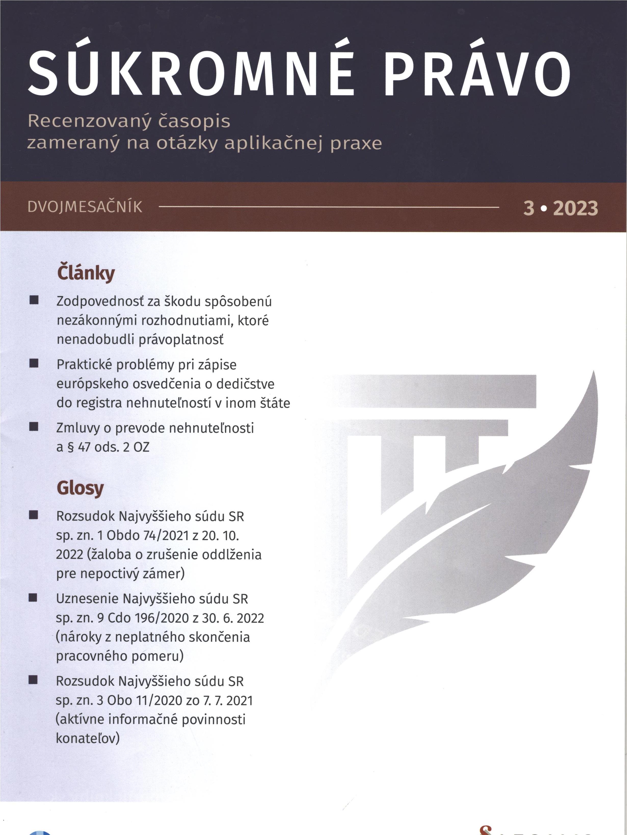 Názov Súkromné právo : recenzovaný časopis zameraný na otázky aplikačnej praxe Vydavateľské údaje Bratislava : Wolters Kluwer SR ISSN 1339-8652 Roč., číslo Roč. 9, č. 3 (2023) Status periodika prijaté (26.07.2023) Druh dokumentu časopisy Jazyk dokumentu slovenčina Krajina vydania Slovenská republika Báza dát PERIODIKÁ - Prijaté čísla Počet ex. 1, z toho voľných 0, prezenčne 1 Odkazy - PERIODIKÁ - Súborný záznam periodika (3) - ČLÁNKY