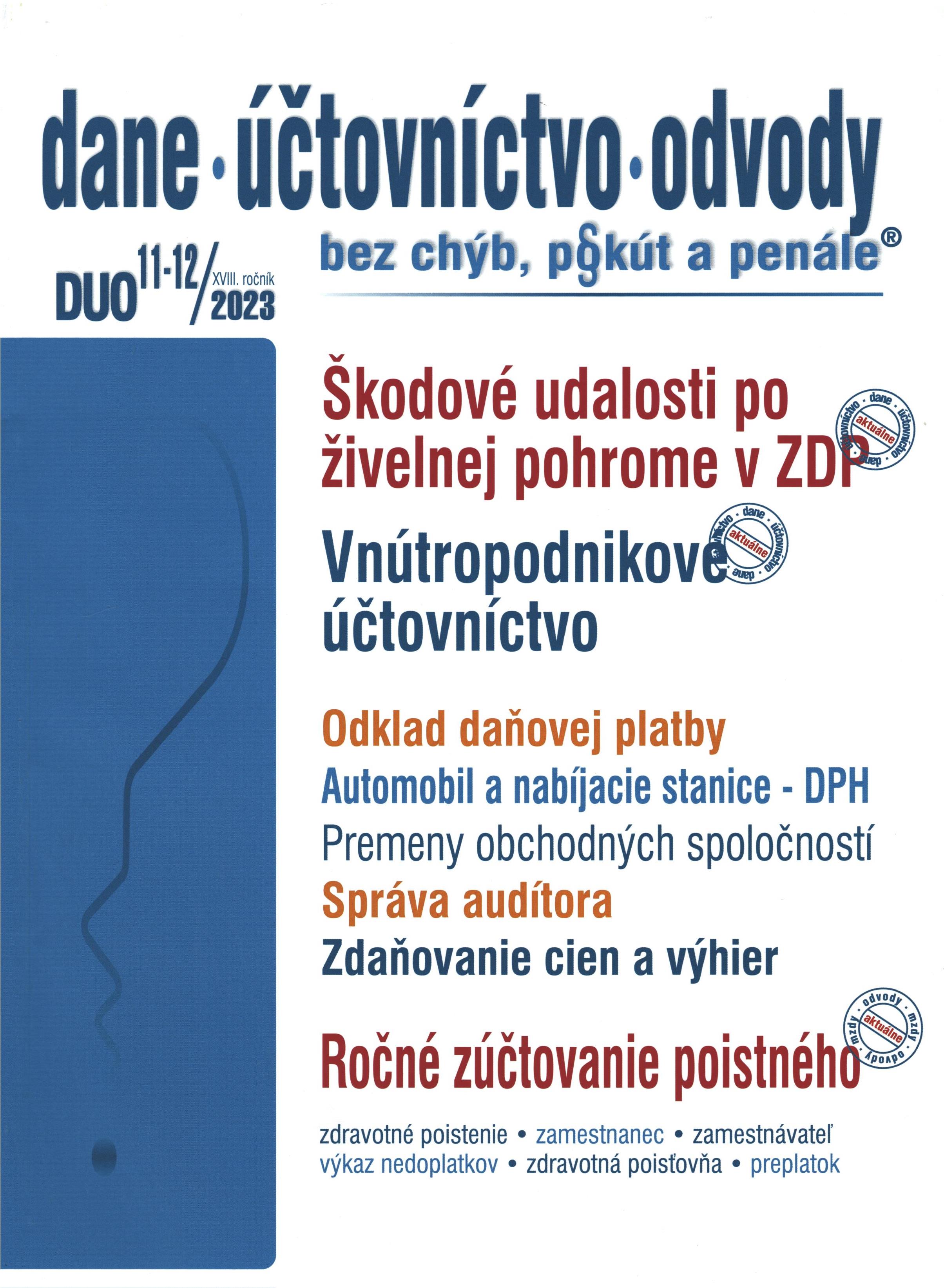 Názov Dane - účtovníctvo - odvody : bez chýb, pokút a penále Vydavateľské údaje Žilina : Poradca ISSN 1336-7986 Roč., číslo Roč. 18, č. 11-12 (2023) Status periodika prijaté (06.10.2023) Druh dokumentu časopisy Jazyk dokumentu slovenčina Krajina vydania Slovenská republika Báza dát PERIODIKÁ - Prijaté čísla Počet ex. 2, z toho voľných 0, prezenčne 2 Odkazy - PERIODIKÁ - Súborný záznam periodika