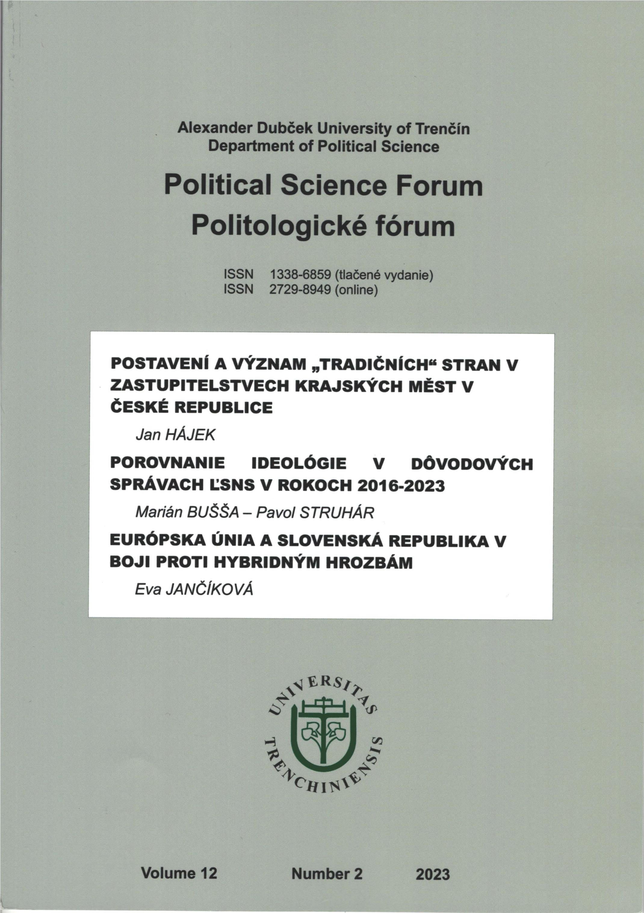 Názov Politologické fórum Súbežný názov Political Science Forum Vydavateľské údaje Trenčín : Trenčianska univerzita Alexandra Dubčeka v Trenčíne ISSN 1338-6859 Roč., číslo Vol. 12, no. 2 (2023) Status periodika prijaté (24.01.2024) Druh dokumentu časopisy Jazyk dokumentu slovenčina Krajina vydania Slovenská republika Báza dát PERIODIKÁ - Prijaté čísla Počet ex. 1, z toho voľných 0, prezenčne 1 Odkazy - PERIODIKÁ - Súborný záznam periodika (2) - PUBLIKAČNÁ ČINNOSŤ