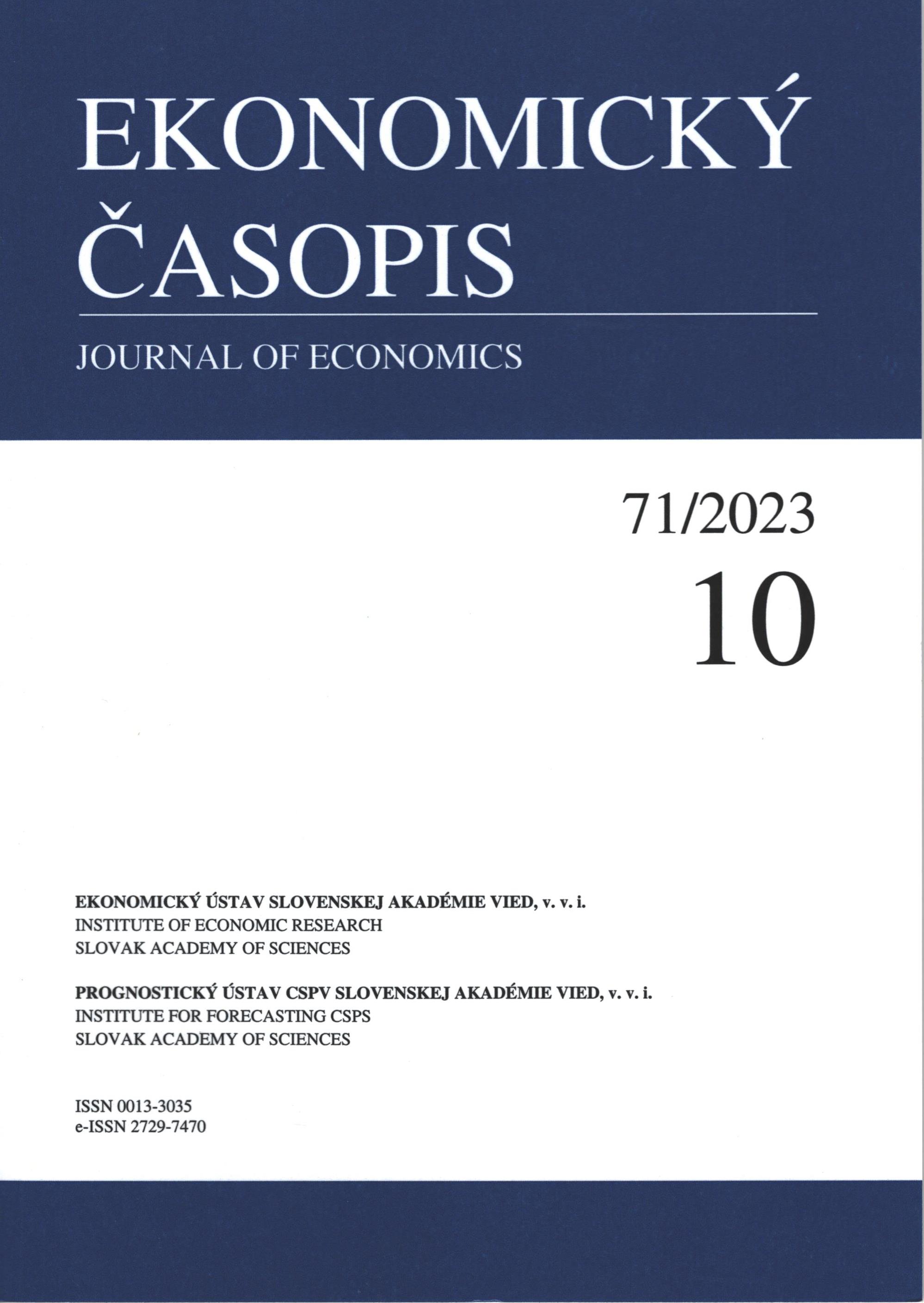 Názov Ekonomický časopis : časopis pre ekonomickú teóriu, hospodársku politiku, spoločensko-ekonomické prognózovanie Súbežný názov Journal of Economics : Journal for Economic Theory, Economic Policy, Social and Economic Forecasting Vydavateľské údaje Bratislava : Ekonomický ústav SAV : Prognostický ústav SAV ISSN 0013-3035 Roč., číslo Roč. 71, č. 10 (2023) Status periodika prijaté (08.03.2024) Druh dokumentu časopisy Jazyk dokumentu angličtina Krajina vydania Slovenská republika Báza dát PERIODIKÁ - Prijaté čísla Počet ex. 6, z toho voľných 0, prezenčne 6 Odkazy - PERIODIKÁ - Súborný záznam periodika (1) - PUBLIKAČNÁ ČINNOSŤ (3) - ČLÁNKY