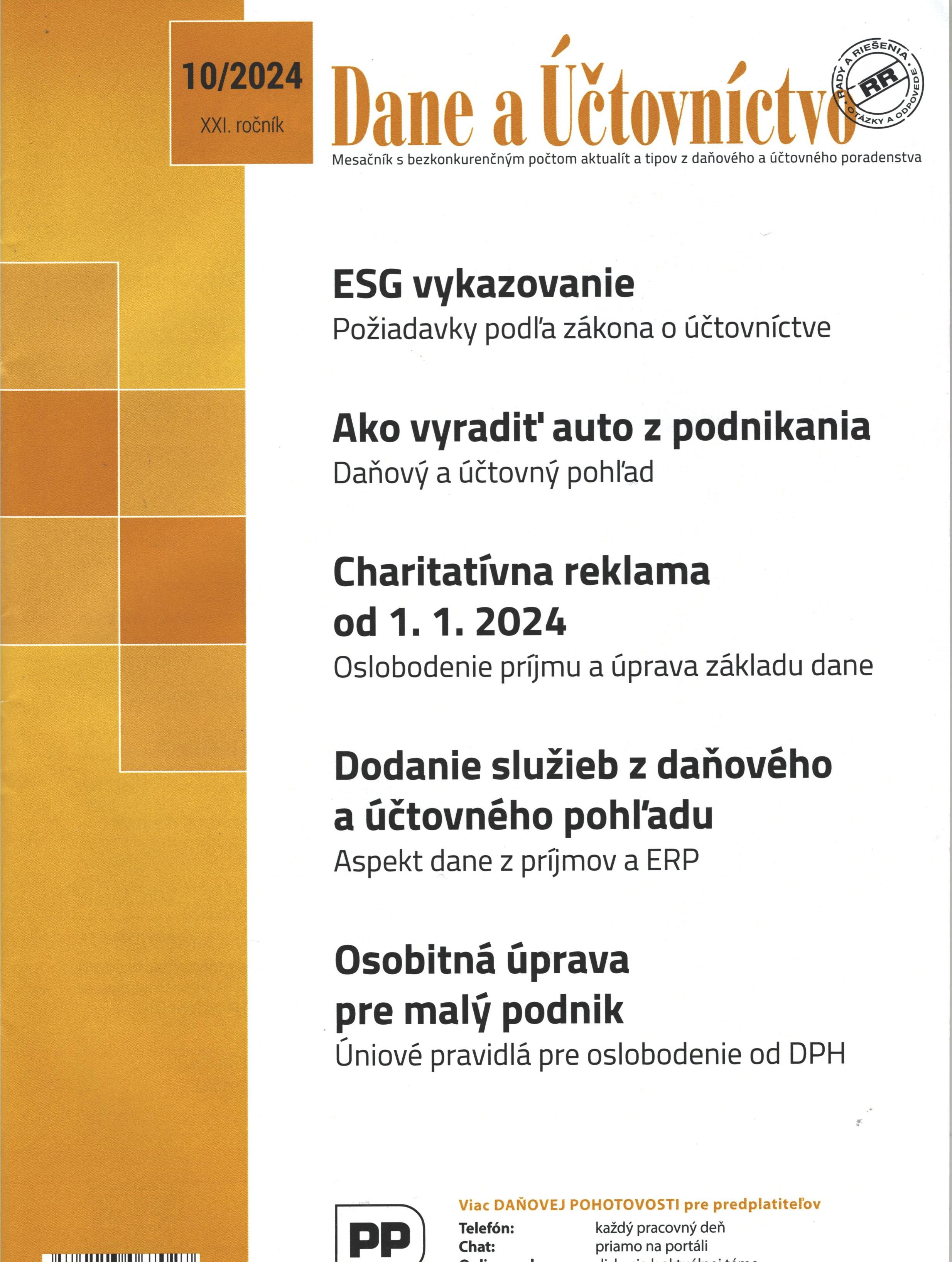 Názov Dane a účtovníctvo : rady a riešenia : mesačník s bezkonkurenčným počtom aktualít a tipov z daňového a účtovného poradenstva Vydavateľské údaje Žilina : Poradca podnikateľa ISSN 1336-426X Roč., číslo Roč. 21, č. 10 (2024) Status periodika prijaté (22.10.2024) Druh dokumentu časopisy Jazyk dokumentu slovenčina Krajina vydania Slovenská republika Báza dát PERIODIKÁ - Prijaté čísla Počet ex. 1, z toho voľných 0, prezenčne 1 Odkazy - PERIODIKÁ - Súborný záznam periodika (7) - ČLÁNKY