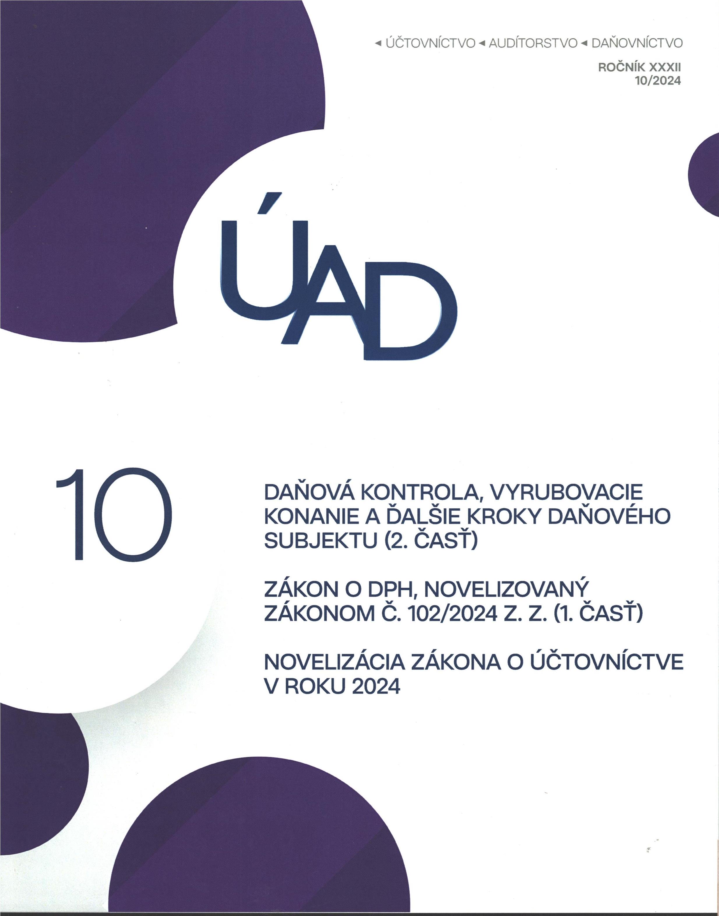 Názov Účtovníctvo - audítorstvo - daňovníctvo : v teórii a praxi Súbežný názov Accounting. Audit. Taxation: in theory and praxis Vydavateľské údaje Bratislava : Slovenská komora certifikovaných účtovníkov ISSN 1335-2024 Roč., číslo Roč. 32, č. 10 (2024) Status periodika prijaté (05.11.2024) Druh dokumentu časopisy Jazyk dokumentu slovenčina Krajina vydania Slovenská republika Báza dát PERIODIKÁ - Prijaté čísla Počet ex. 2, z toho voľných 0, prezenčne 2 Odkazy - PERIODIKÁ - Súborný záznam periodika (3) - ČLÁNKY