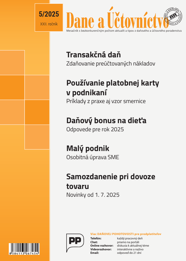 Názov Dane a účtovníctvo : rady a riešenia : mesačník s bezkonkurenčným počtom aktualít a tipov z daňového a účtovného poradenstva Vydavateľské údaje Žilina : Poradca podnikateľa ISSN 1336-426X Roč., číslo Roč. 22, č. 5 (2025) Status periodika prijaté (30.04.2025) Druh dokumentu časopisy Jazyk dokumentu slovenčina Krajina vydania Slovenská republika Báza dát PERIODIKÁ - Prijaté čísla Počet ex. 1, z toho voľných 0, prezenčne 1 Odkazy - PERIODIKÁ - Súborný záznam periodika (8) - ČLÁNKY