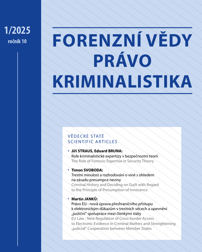 Názov Forenzní vědy, právo, kriminalistika : Vědecké studie a analýzy: vědecký časopis : Scientific Studies and Analyses: Scientific Journal Vydavateľské údaje Praha : Vysoká škola finanční a správní ISSN 2533-4387 Roč., číslo Roč. 10, č. 1 (2025) Status periodika prijaté (19.05.2025) Druh dokumentu časopisy Jazyk dokumentu čeština Krajina vydania Česká republika Báza dát PERIODIKÁ - Prijaté čísla Odkazy - PERIODIKÁ - Súborný záznam periodika (4) - ČLÁNKY