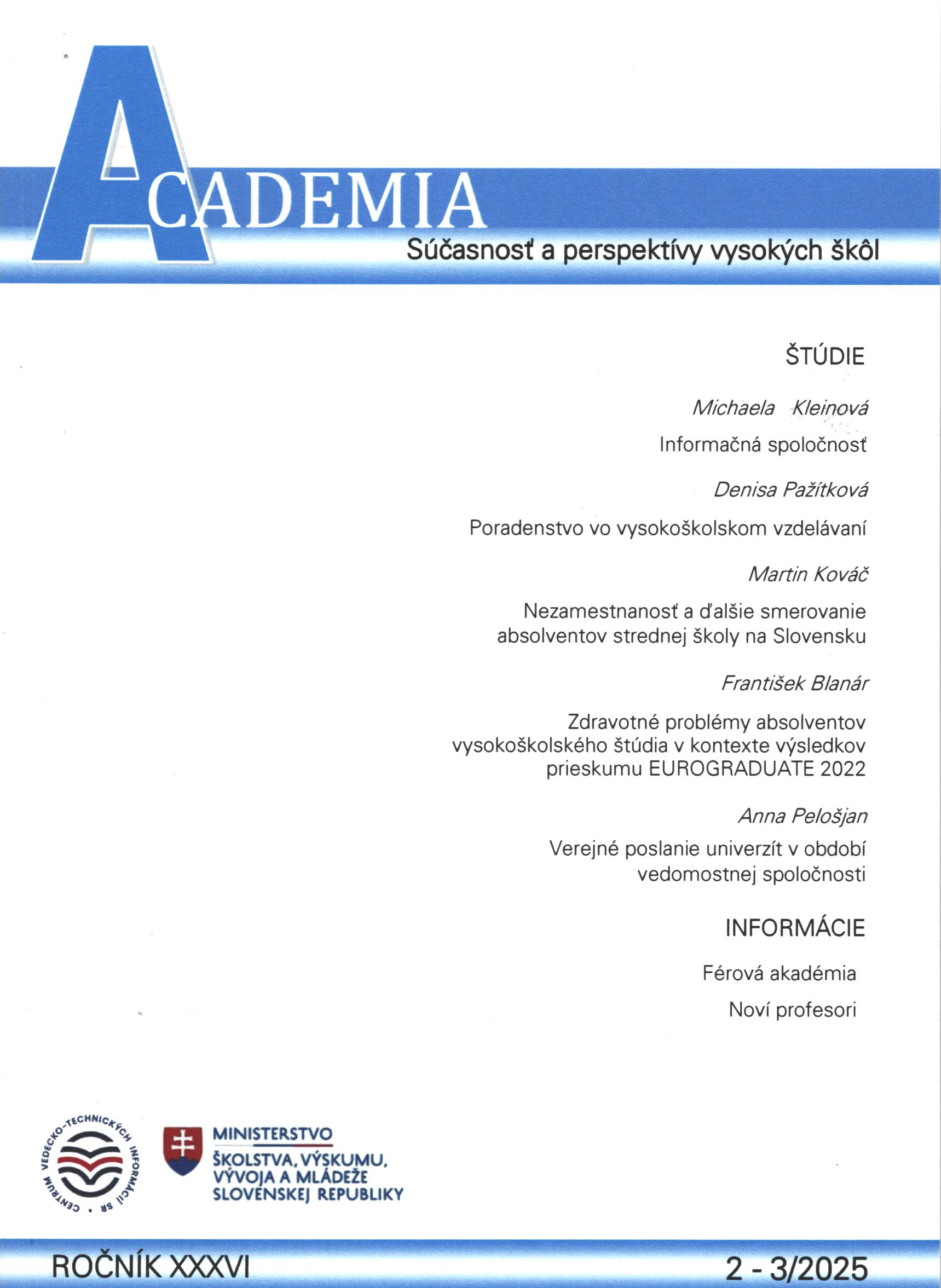 Title ACADEMIA : súčasnosť a perspektívy vysokých škôl Issue data Bratislava : Centrum vedecko-technických informácií SR ISSN 1335-5864 Year, No. Roč. 36, č. 2-3 (2025) Periodicals status Accepted (17.10.2025) Document kind časopisy Language Slovak Country of Edition Slovak Republic Database PERIODIKÁ - Prijaté čísla Copy count 9, currently available 0, at library only 9 References - PERIODIKÁ - Súborný záznam periodika (5) - ARTICLES