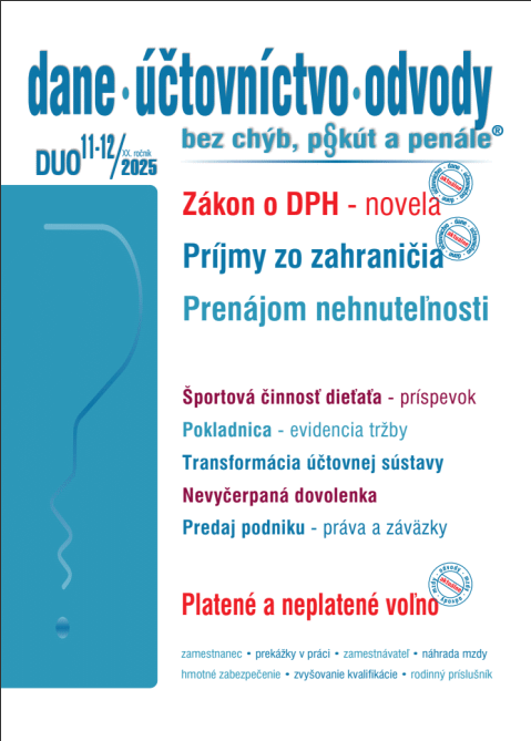 Názov Dane - účtovníctvo - odvody : bez chýb, pokút a penále Vydavateľské údaje Žilina : Poradca ISSN 1336-7986 Roč., číslo Roč. 20, č. 11-12 (2025) Status periodika prijaté (30.10.2025) Druh dokumentu časopisy Jazyk dokumentu slovenčina Krajina vydania Slovenská republika Báza dát PERIODIKÁ - Prijaté čísla Počet ex. 1, z toho voľných 0, prezenčne 1 Odkazy - PERIODIKÁ - Súborný záznam periodika