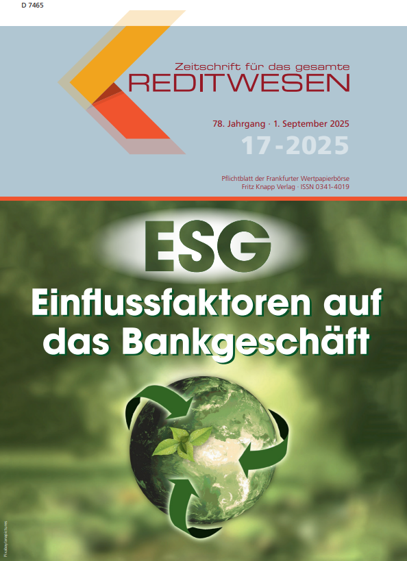 Názov Zeitschrift für das gesamte Kreditwesen : Pflichtblatt der Frankfurter Wertpapierbörse Vydavateľské údaje Frankfurt am Main : Fritz Knapp Verlag ISSN 0341-4019 Roč., číslo Jg. 78, Hf. 17 (2025) Status periodika prijaté (05.11.2025) Druh dokumentu časopisy Jazyk dokumentu nemčina Krajina vydania Nemecko Báza dát PERIODIKÁ - Prijaté čísla Odkazy - PERIODIKÁ - Súborný záznam periodika