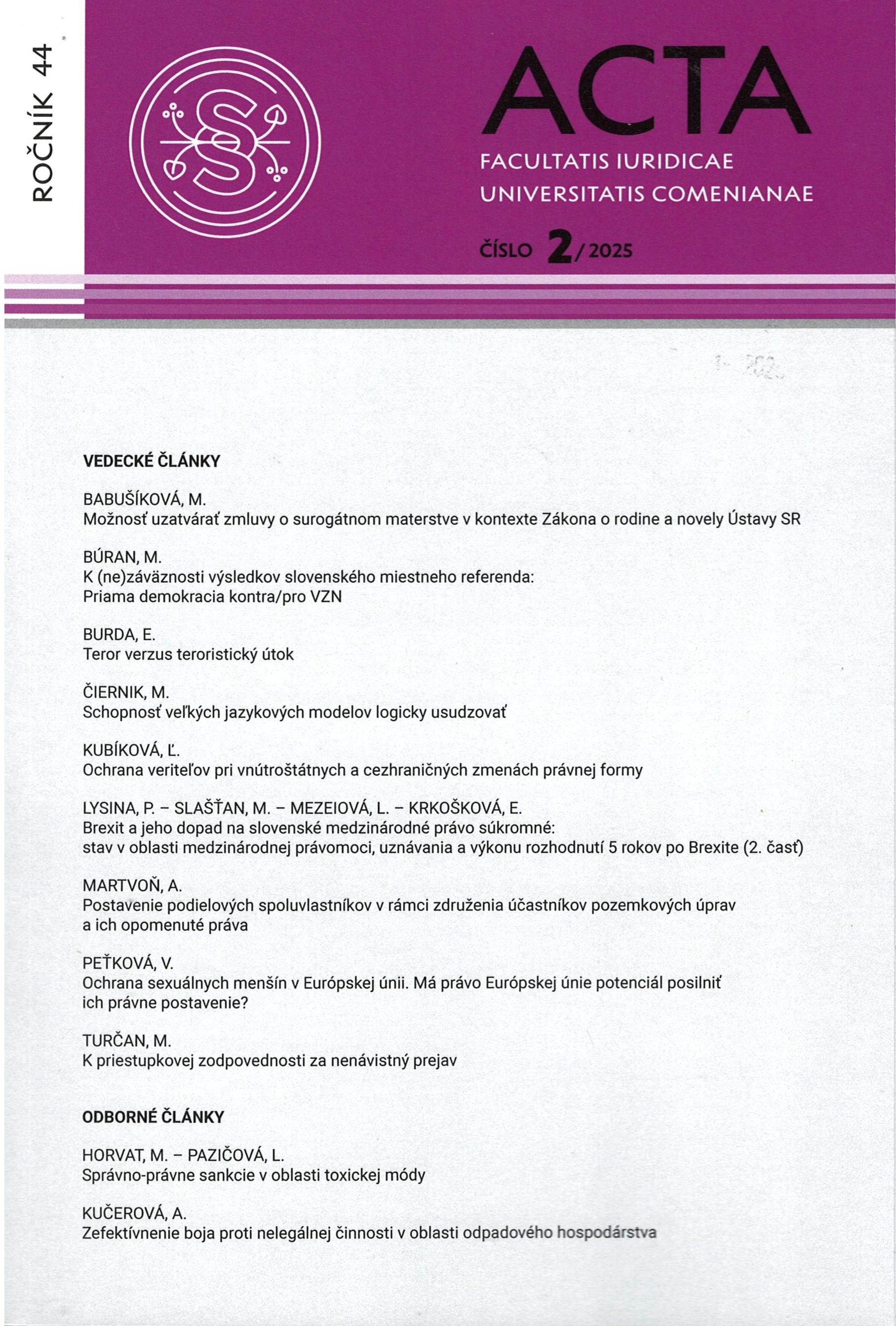 Názov Acta Facultatis Iuridicae Universitatis Comenianae : vedecký časopis Právnickej fakulty Vydavateľské údaje Bratislava : Univerzita Komenského v Bratislave ISSN 1336-6912 Roč., číslo Roč. 44, č. 2 (2025) Status periodika prijaté (18.02.2026) Druh dokumentu časopisy Jazyk dokumentu slovenčina Krajina vydania Slovenská republika Báza dát PERIODIKÁ - Prijaté čísla Počet ex. 1, z toho voľných 0, prezenčne 1 Odkazy - PERIODIKÁ - Súborný záznam periodika (4) - ČLÁNKY