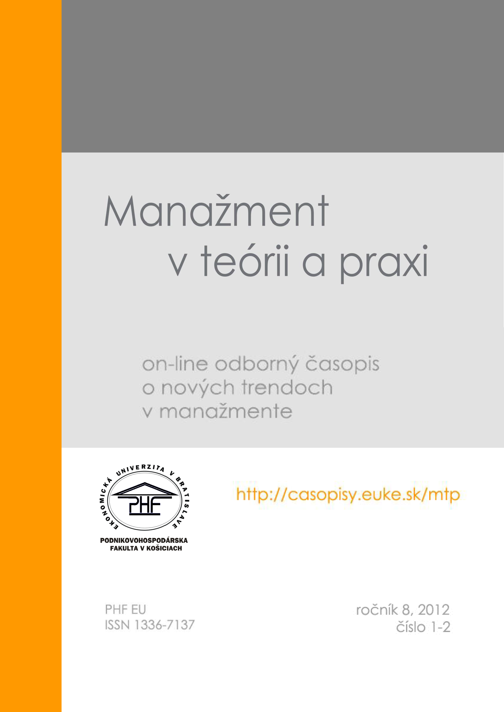 Názov Manažment v teórii a praxi [elektronický zdroj] : online odborný časopis o nových trendoch v manažmente Vydavateľské údaje Košice : Katedra manažmentu PHF EU ISSN 1336-7137 Roč., číslo Roč. 8, č. 1-2 (2012) Druh dokumentu elektronické časopisy Jazyk dokumentu slovenčina Krajina vydania Slovenská republika Báza dát PERIODIKÁ - Prijaté čísla Odkazy - PERIODIKÁ - Súborný záznam periodika (2) - PUBLIKAČNÁ ČINNOSŤ (5) - ČLÁNKY