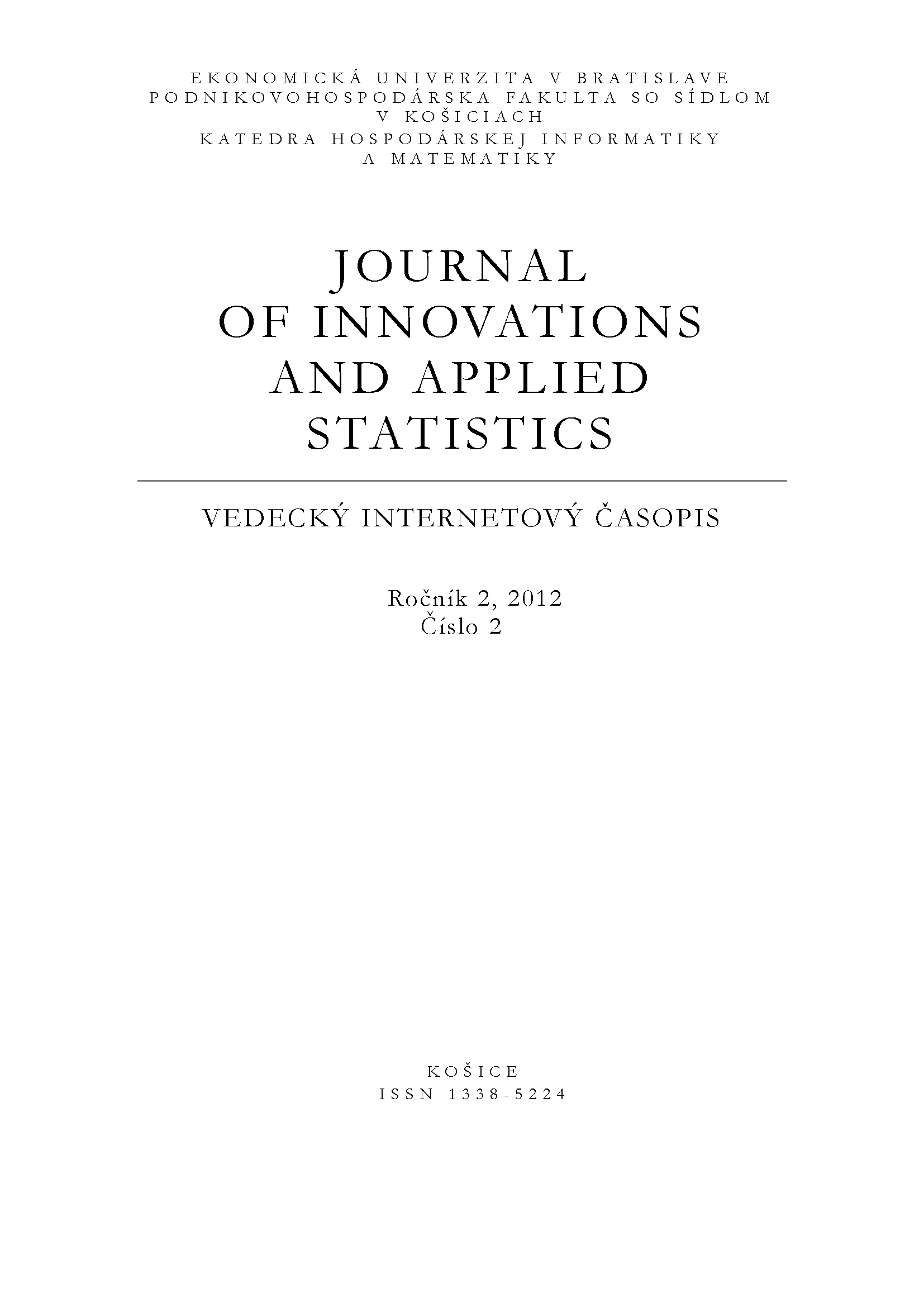 Názov Journal of innovations and applied statistics [elektronický zdroj] : vedecký internetový časopis Vydavateľské údaje Košice : Katedra hospodárskej informatiky a matematiky PHF EU ISSN 1338-5224 Roč., číslo Roč. 2, č. 2 (2012) Druh dokumentu elektronické časopisy Jazyk dokumentu slovenčina Krajina vydania Slovenská republika Báza dát PERIODIKÁ - Prijaté čísla Odkazy - PERIODIKÁ - Súborný záznam periodika (4) - PUBLIKAČNÁ ČINNOSŤ (1) - ČLÁNKY