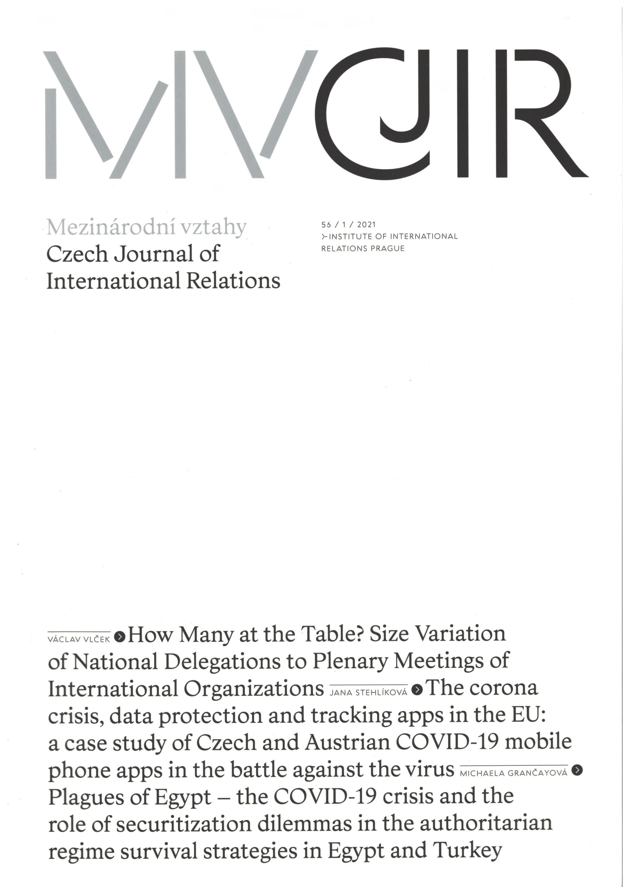 Názov Mezinárodní vztahy Súbežný názov Czech Journal of International Relations Vydavateľské údaje Praha : Institute of International Relations ISSN 0323-1844 Roč., číslo Roč. 56, č. 1 (2021) Status periodika prijaté (28.04.2021) Druh dokumentu časopisy Jazyk dokumentu čeština Krajina vydania Česká republika Báza dát PERIODIKÁ - Prijaté čísla Počet ex. 2, z toho voľných 0, prezenčne 2 Odkazy - PERIODIKÁ - Súborný záznam periodika - PERIODIKÁ - Zviazaný ročník periodika (4) - ČLÁNKY