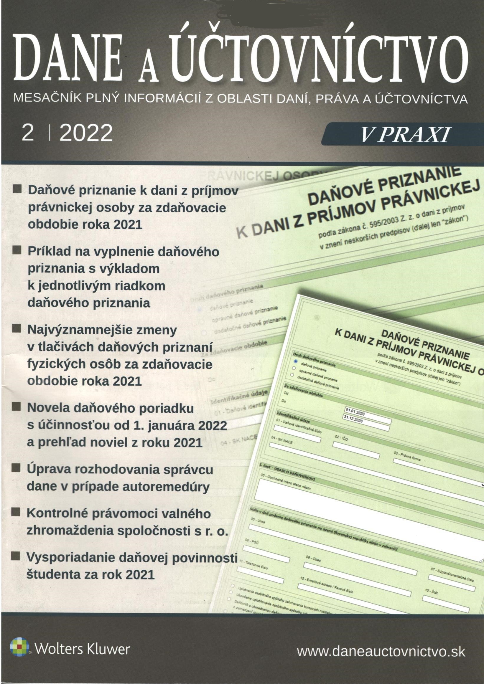 Názov Dane a účtovníctvo v praxi : mesačník plný informácií z oblasti daní, práva a účtovníctva Vydavateľské údaje Bratislava : Wolters Kluwer ISSN 1335-7034 Roč., číslo Roč. 27, č. 2 (2022) Status periodika prijaté (11.02.2022) Druh dokumentu časopisy Jazyk dokumentu slovenčina Krajina vydania Slovenská republika Báza dát PERIODIKÁ - Prijaté čísla Počet ex. 2, z toho voľných 0, prezenčne 2 Odkazy - PERIODIKÁ - Súborný záznam periodika (5) - ČLÁNKY