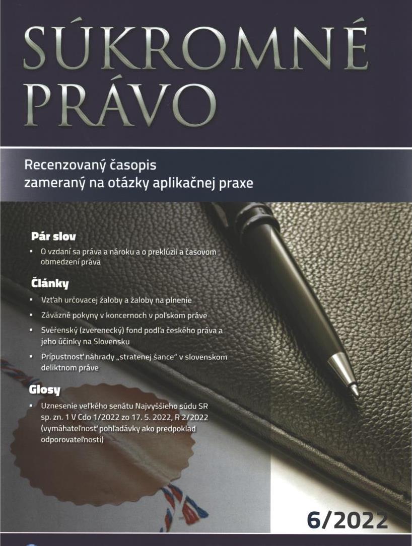 Názov Súkromné právo : recenzovaný časopis zameraný na otázky aplikačnej praxe Vydavateľské údaje Bratislava : Wolters Kluwer SR ISSN 1339-8652 Roč., číslo Roč. 8, č. 6 (2022) Status periodika prijaté (23.12.2022) Druh dokumentu časopisy Jazyk dokumentu slovenčina Krajina vydania Slovenská republika Báza dát PERIODIKÁ - Prijaté čísla Počet ex. 1, z toho voľných 0, prezenčne 1 Odkazy - PERIODIKÁ - Súborný záznam periodika (1) - ČLÁNKY