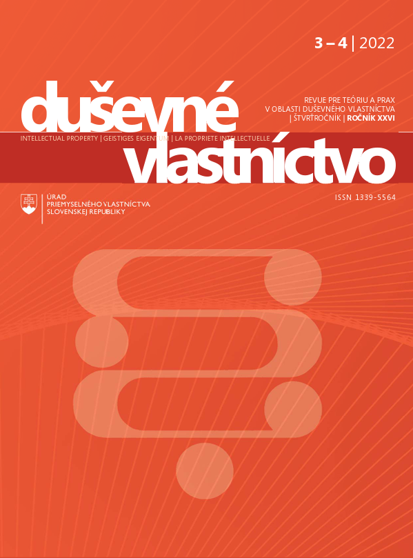 Názov Duševné vlastníctvo [elektronický zdroj] : revue pre teóriu a prax v oblasti duševného vlastníctva Súbežný názov Intellectual property : revue for theory and practice in the field of intellectual property Geistiges Eigentum La Propriété intellectuelle Vydavateľské údaje Banská Bystrica : Úrad priemyselného vlastníctva SR ISSN 1339-5564 Roč., číslo Roč. 26, č. 3-4 (2022) Status periodika prijaté (26.01.2023) Druh dokumentu elektronické časopisy Jazyk dokumentu slovenčina Krajina vydania Slovenská republika Báza dát PERIODIKÁ - Prijaté čísla Odkazy - PERIODIKÁ - Súborný záznam periodika (6) - ČLÁNKY