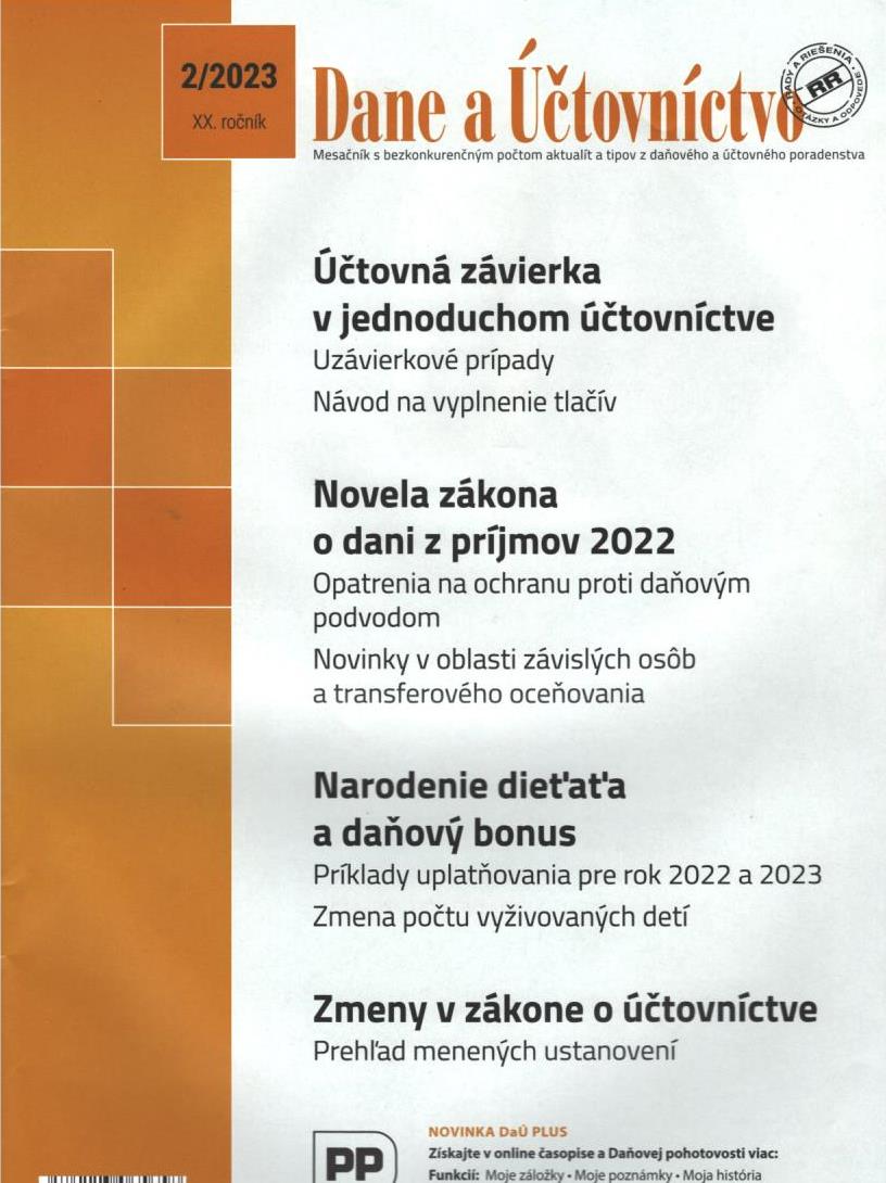 Názov Dane a účtovníctvo : rady a riešenia : mesačník s bezkonkurenčným počtom aktualít a tipov z daňového a účtovného poradenstva Vydavateľské údaje Žilina : Poradca podnikateľa ISSN 1336-426X Roč., číslo Roč. 20, č. 2 (2023) Status periodika prijaté (30.01.2023) Druh dokumentu časopisy Jazyk dokumentu slovenčina Krajina vydania Slovenská republika Báza dát PERIODIKÁ - Prijaté čísla Počet ex. 1, z toho voľných 0, prezenčne 1 Odkazy - PERIODIKÁ - Súborný záznam periodika (5) - ČLÁNKY