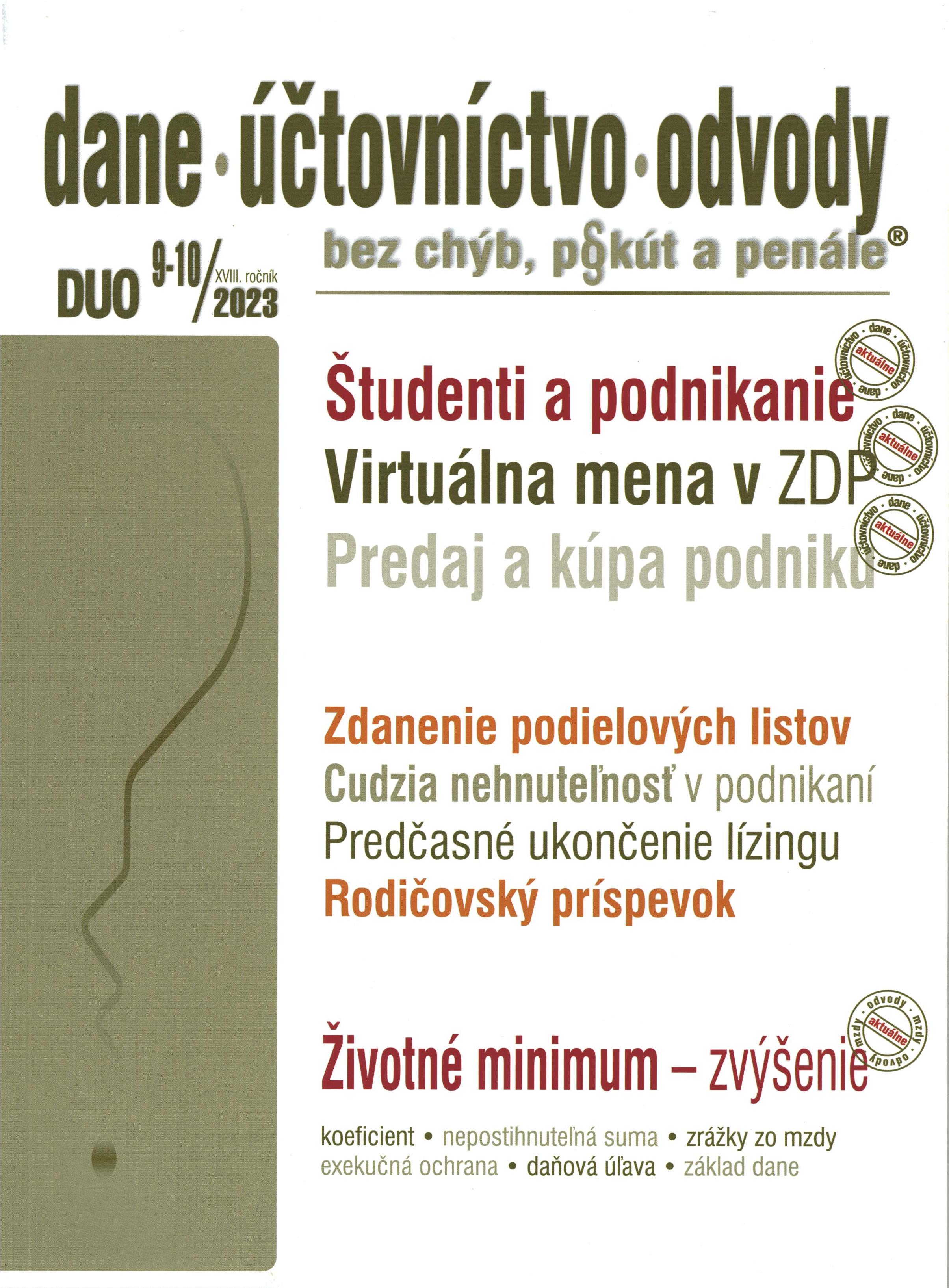 Názov Dane - účtovníctvo - odvody : bez chýb, pokút a penále Vydavateľské údaje Žilina : Poradca ISSN 1336-7986 Roč., číslo Roč. 18, č. 9-10 (2023) Status periodika prijaté (25.09.2023) Druh dokumentu časopisy Jazyk dokumentu slovenčina Krajina vydania Slovenská republika Báza dát PERIODIKÁ - Prijaté čísla Počet ex. 2, z toho voľných 0, prezenčne 2 Odkazy - PERIODIKÁ - Súborný záznam periodika