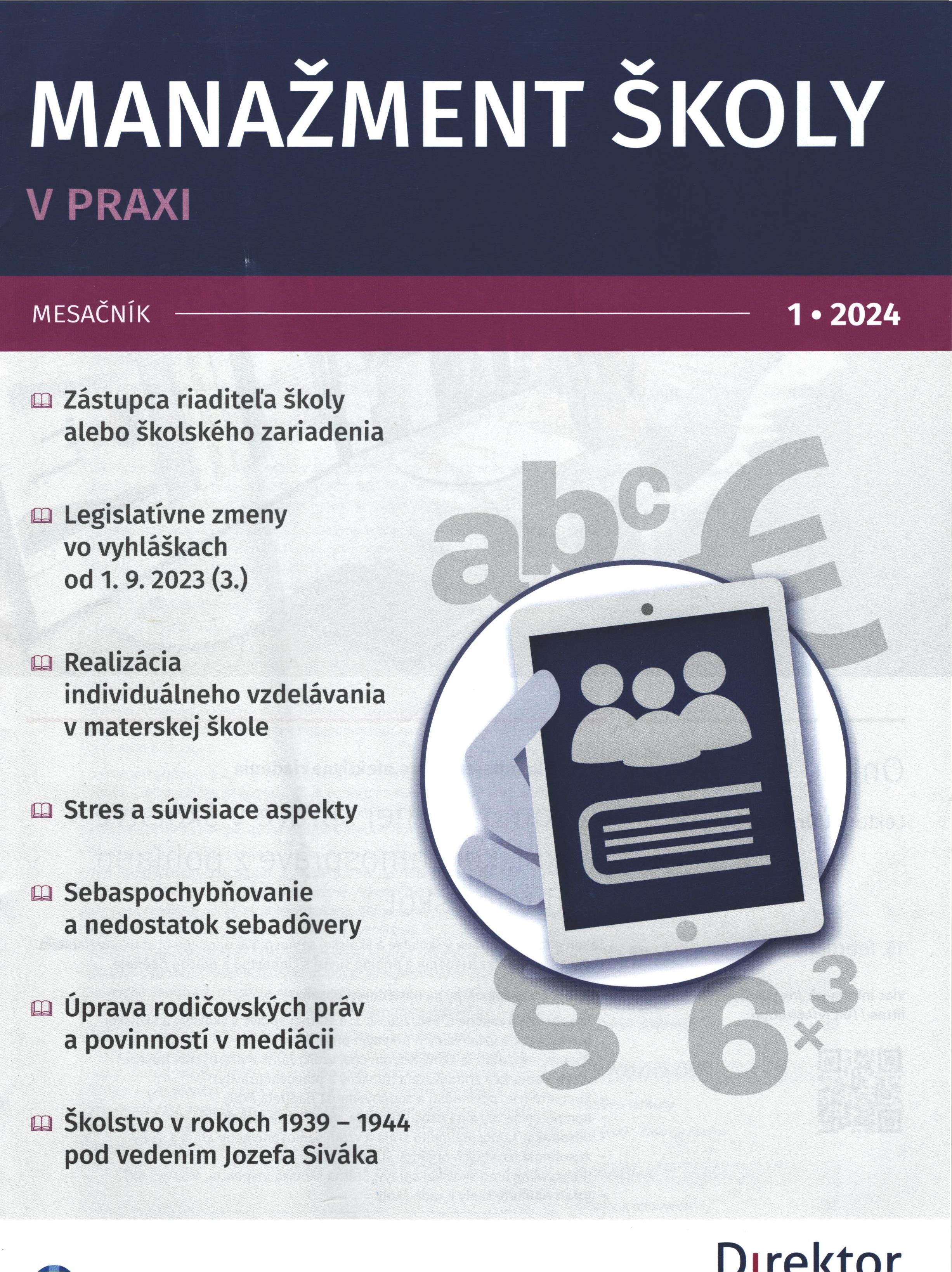 1. 2024 ,č. 1. Manažment školy v praxi : [odborný mesačník]. Bratislava : Wolters Kluwer, 2024. ISSN 1336-9849 [Počet ex. : 2, z toho voľných 0, prezenčne 2]