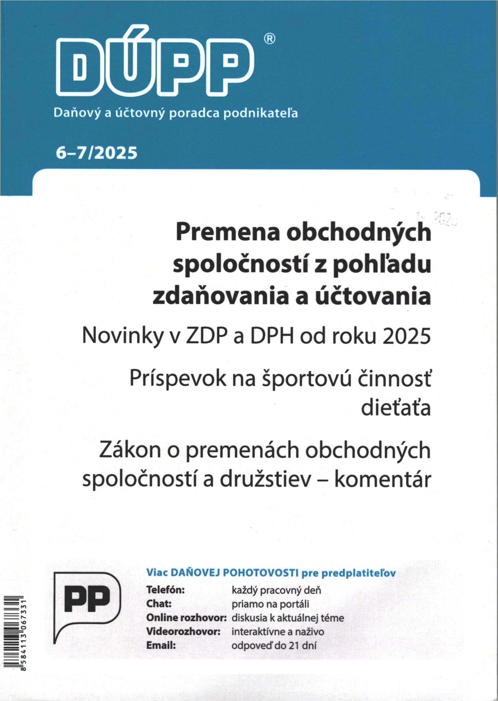Názov Daňový a účtovný poradca podnikateľa Vydavateľské údaje Žilina : Poradca podnikateľa ISSN 1335-0897 Roč., číslo Roč. 30, č. 6-7 (2025) Status periodika prijaté (10.03.2025) Druh dokumentu časopisy Jazyk dokumentu slovenčina Krajina vydania Slovenská republika Báza dát PERIODIKÁ - Prijaté čísla Počet ex. 2, z toho voľných 0, prezenčne 2 Odkazy - PERIODIKÁ - Súborný záznam periodika (2) - ČLÁNKY