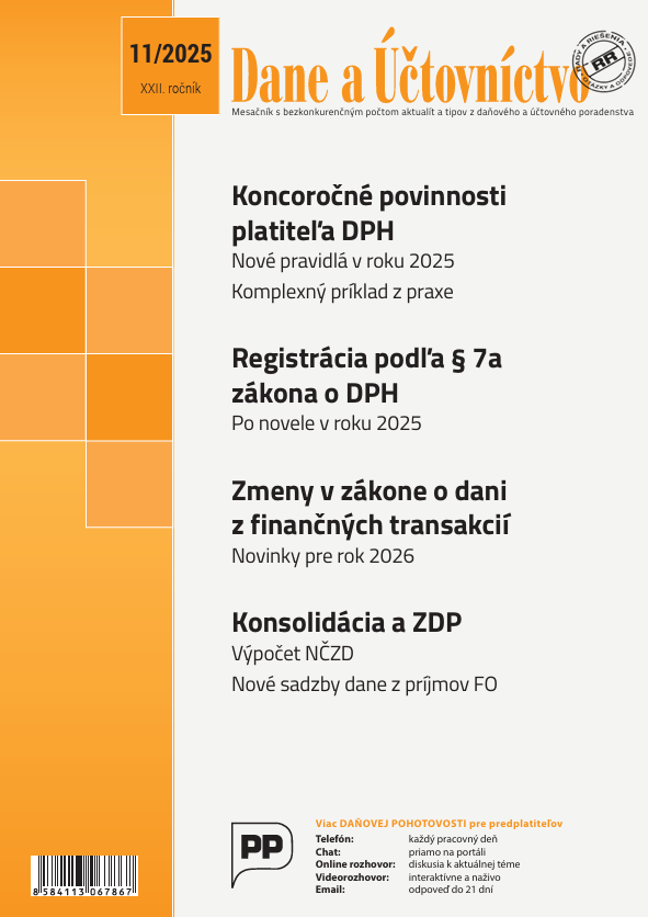 Názov Dane a účtovníctvo : rady a riešenia : mesačník s bezkonkurenčným počtom aktualít a tipov z daňového a účtovného poradenstva Vydavateľské údaje Žilina : Poradca podnikateľa ISSN 1336-426X Roč., číslo Roč. 22, č. 11 (2025) Status periodika prijaté (01.12.2025) Druh dokumentu časopisy Jazyk dokumentu slovenčina Krajina vydania Slovenská republika Báza dát PERIODIKÁ - Prijaté čísla Počet ex. 1, z toho voľných 0, prezenčne 1 Odkazy - PERIODIKÁ - Súborný záznam periodika (7) - ČLÁNKY